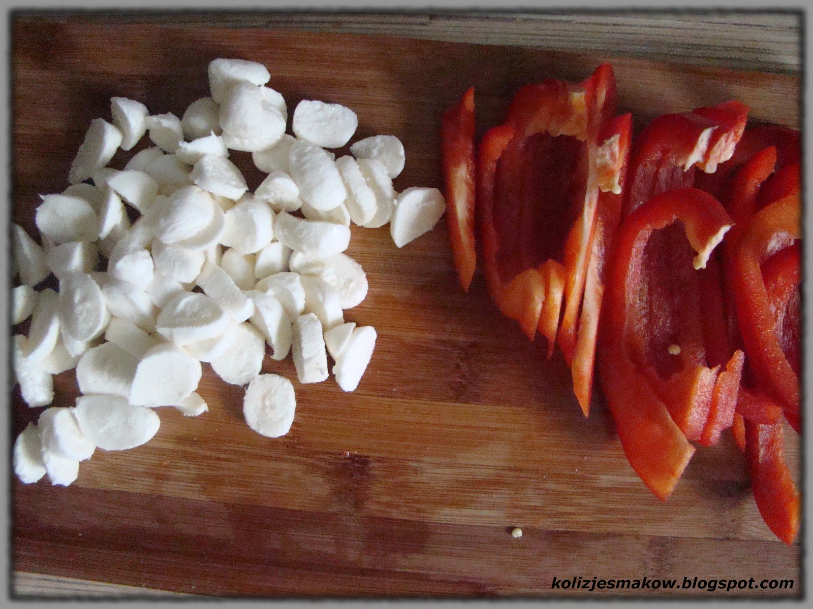 kuleczek sera, ale równie dobrze mogą to być plastry większych kulek. Wstawiamy